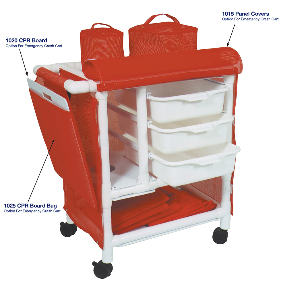 Healthcare Grade, Reinforced At All Stress Related Areas, Holds E Series Oxygen Cylinders, Top Shelf Is Used For Suction Machine, 3 Pull Out Storage Tubs, Light Weight And Easy To Maneuver, Emergency Crash Cart.