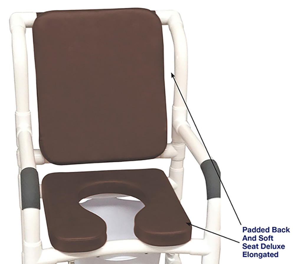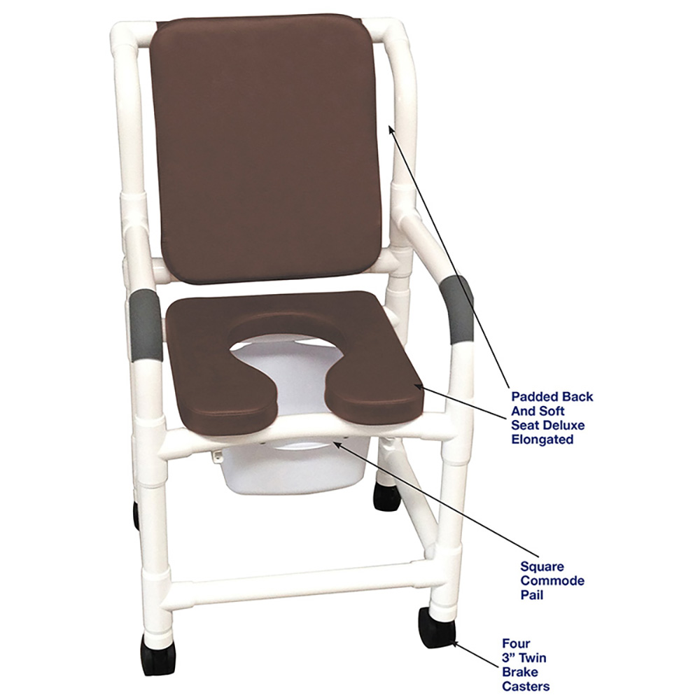 Shower Chair With Brown Soft Seat Deluxe Elongated, Cushion Back And Square Pail