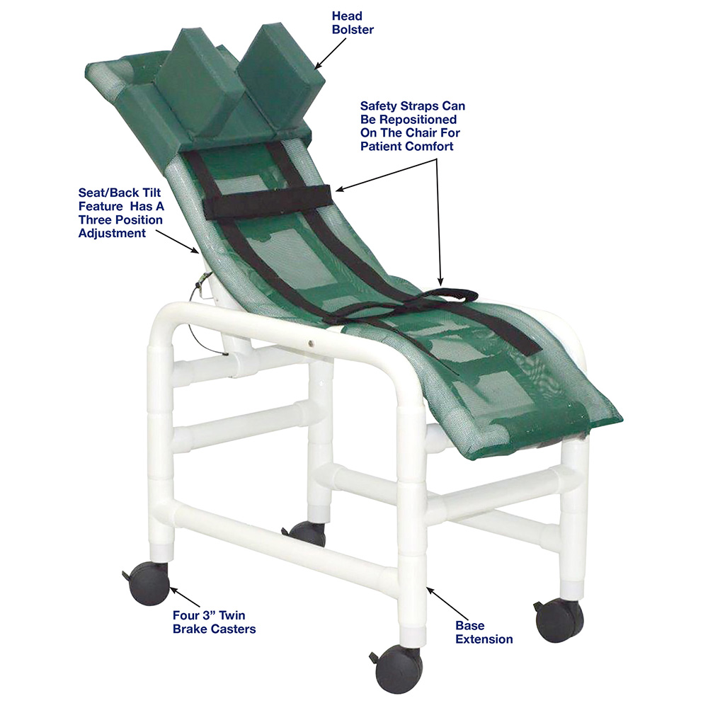 Healthcare Grade, Reinforced At All Stress Related Areas, Three Position Adjustment Seat/Back Tilts 30° - 70°, Adjustable Safety Straps Hold And Secure Individual In Place, Mesh Vinyl Sling Drains Well And Removes Easily For Washing, Full Head And Trunk Support, Lightweight Rust Proof Frame.
