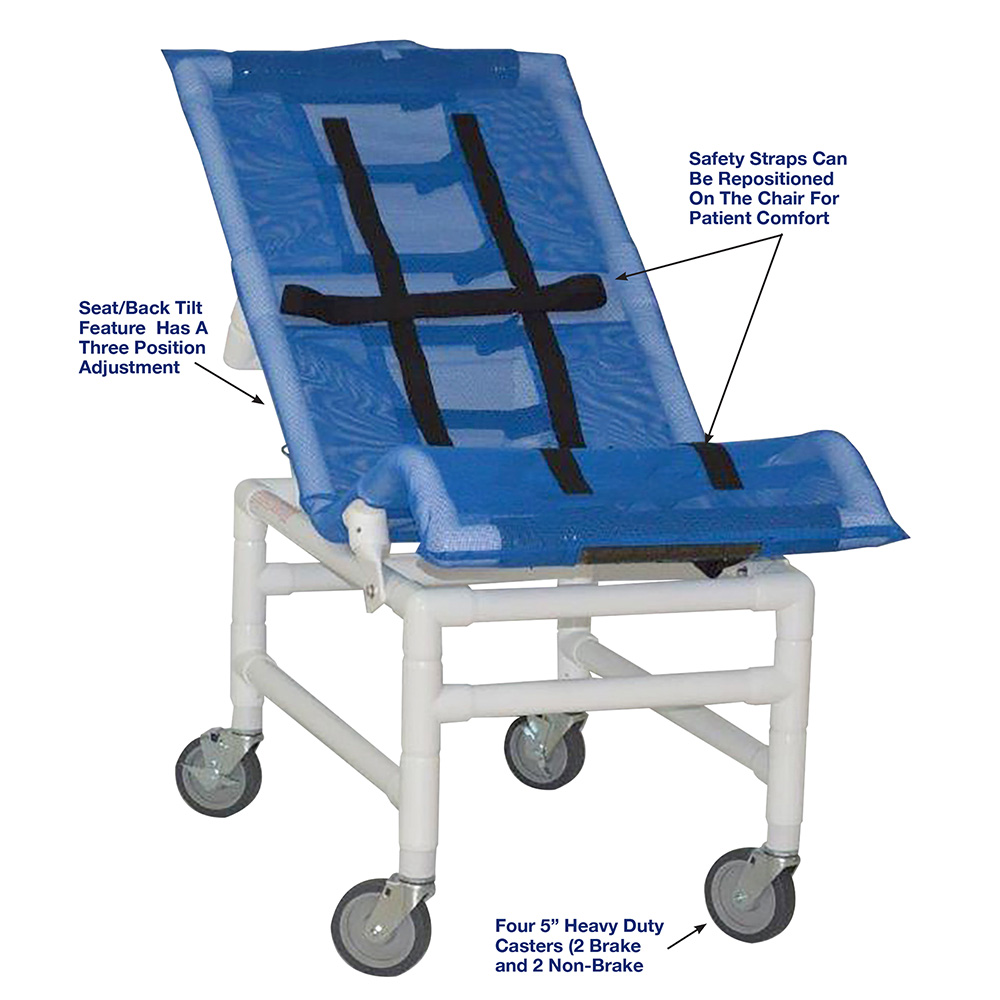 Healthcare Grade, Reinforced At All Stress Related Areas, Three Position Adjustment Seat/Back Tilts 30° - 70°, Adjustable Safety Straps Hold And Secure Individual In Place, Mesh Vinyl Sling Drains Well And Removes Easily For Washing, Full Head And Trunk Support, Lightweight Rust Proof Frame.