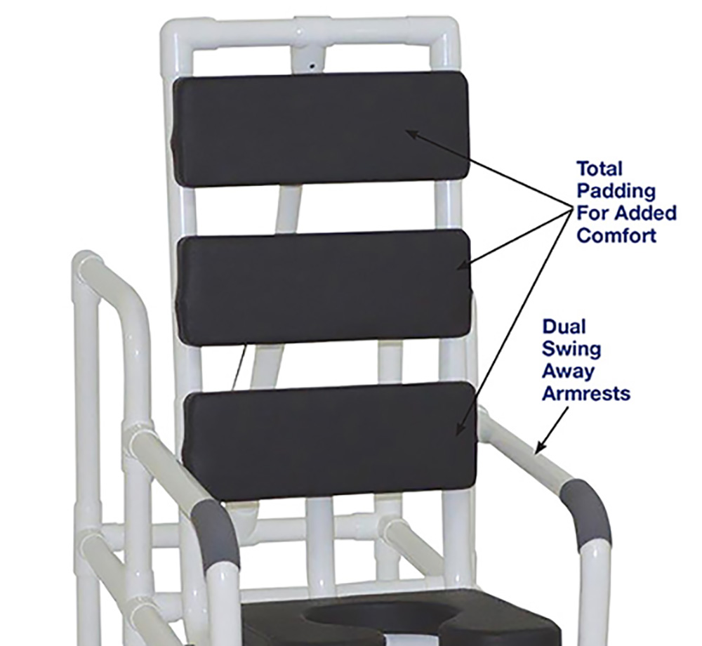 Healthcare Grade, Tilt-N- Space Shower Chair, Deluxe Elongated Open Front Soft Seat With Total Padding, 4” Twin Casters, Dual Drop Arm (Secured With Safety Vinyl Straps), Reinforced At All Stress Related Areas, Must Be Used With Assistance.