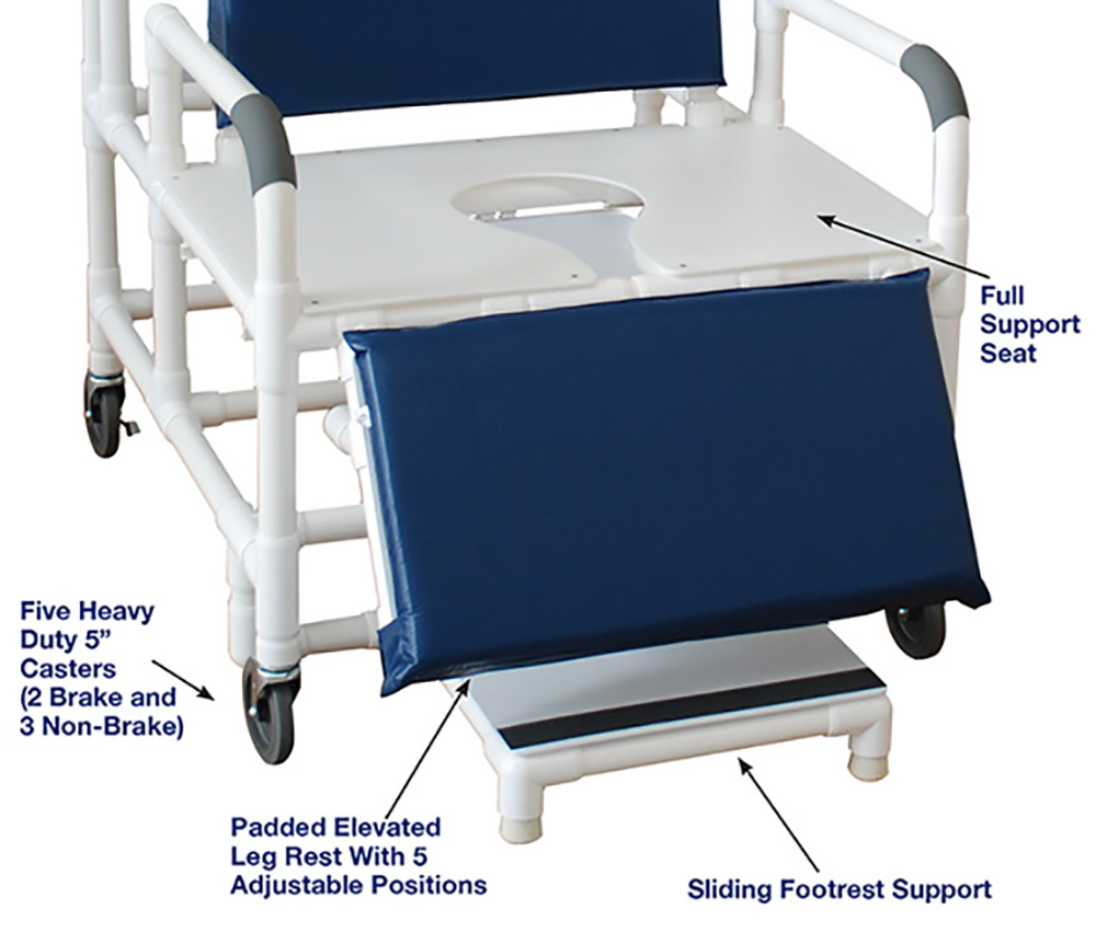 Healthcare Grade, Deluxe Elongated Open Front Full Support Seat Enhances Resident Comfort, Safety Handgrips And Fast Drying Removable Mesh Back/Sling, User Friendly Self Storing Sliding Footrest Prevents Foot Dragging And Entrapment.