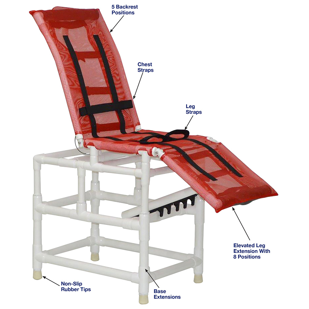 Healthcare Grade, Reinforced At All Stress Related Areas, Multi-Positioning Shower Chair, 5 Backrest Positions, Elevated Leg Extension With 8 Positions, Chest and Leg Straps Can Be Adjusted And Repositioned for Comfort And Security, Small Bath Chair Fits In Standard Size Bath Tubs.