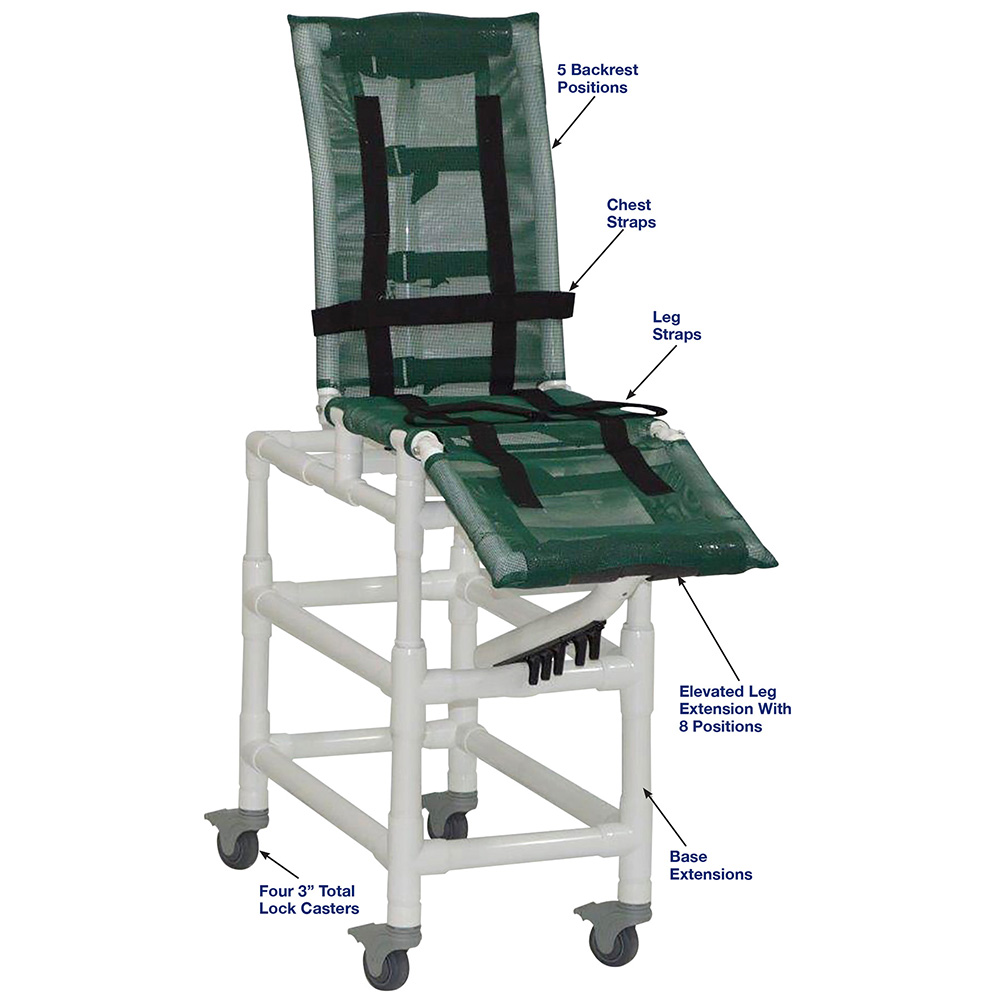Healthcare Grade, Reinforced At All Stress Related Areas, Multi-Positioning Shower Chair, 5 Backrest Positions, Elevated Leg Extension With 8 Positions, Chest and Leg Straps Can Be Adjusted And Repositioned for Comfort And Security, Small Bath Chair Fits In Standard Size Bath Tubs.