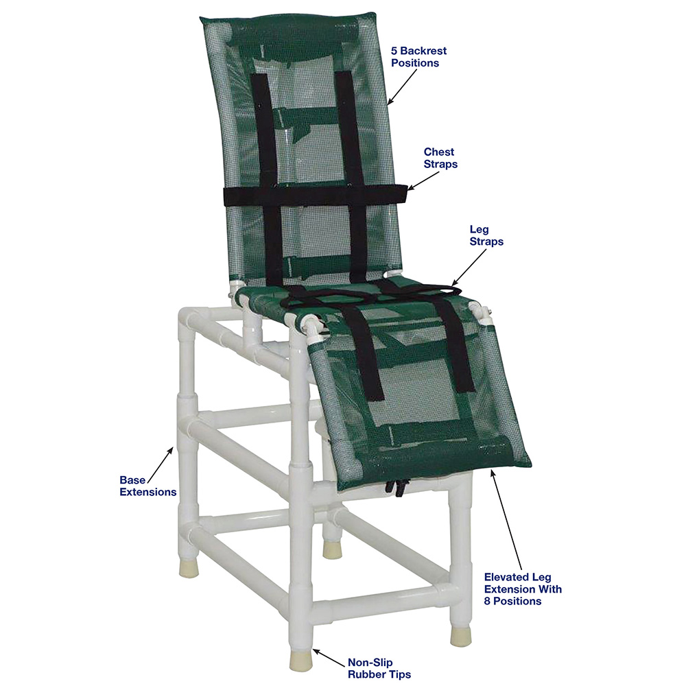 Healthcare Grade, Reinforced At All Stress Related Areas, Multi-Positioning Shower Chair, 5 Backrest Positions, Elevated Leg Extension With 8 Positions, Chest and Leg Straps Can Be Adjusted And Repositioned for Comfort And Security, Small Bath Chair Fits In Standard Size Bath Tubs.