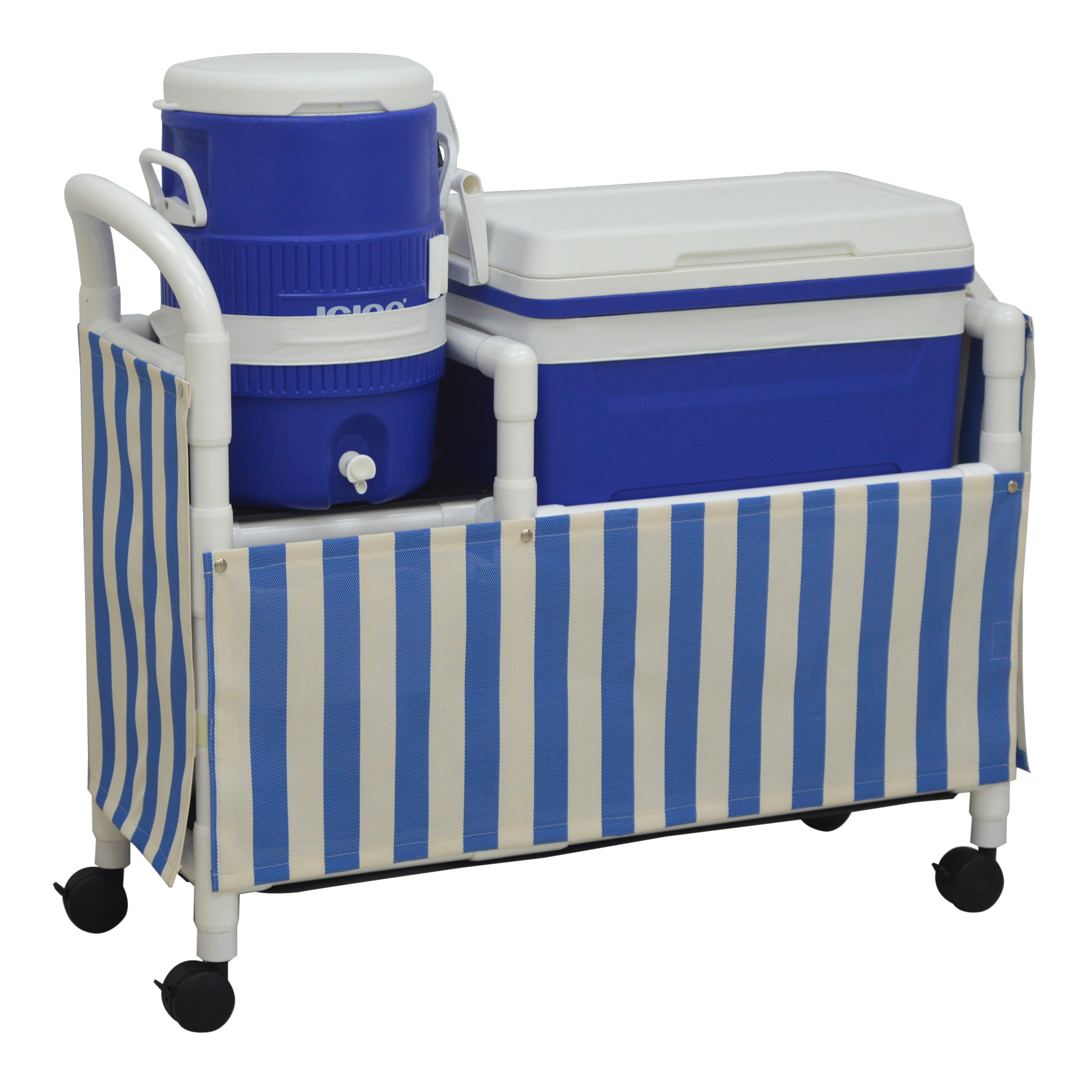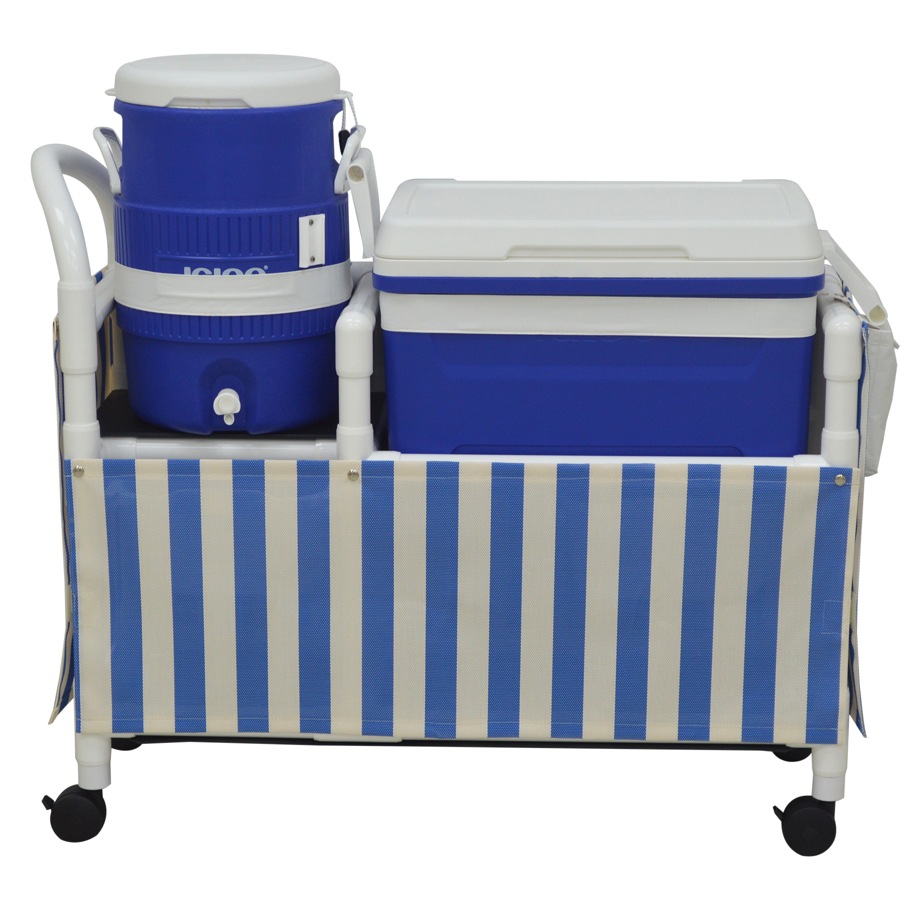 Healthcare Grade, Reinforced At All Stress Related Areas, Hydration/Ice Cart With Royal Café Designer Mesh Skirt Cover Panels, 48 Quart Ice Chest, 5 Gallon Water Cooler, Ice Scoop, 2 Pull Out Storage, Storage Shelf.
