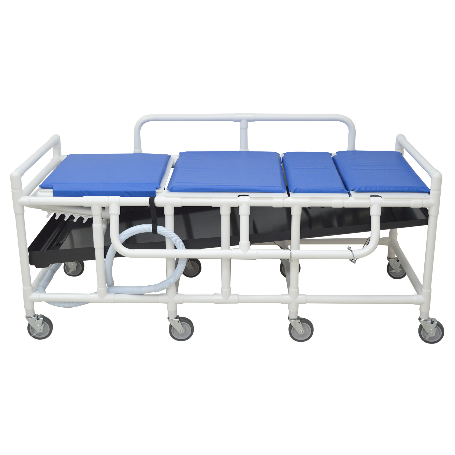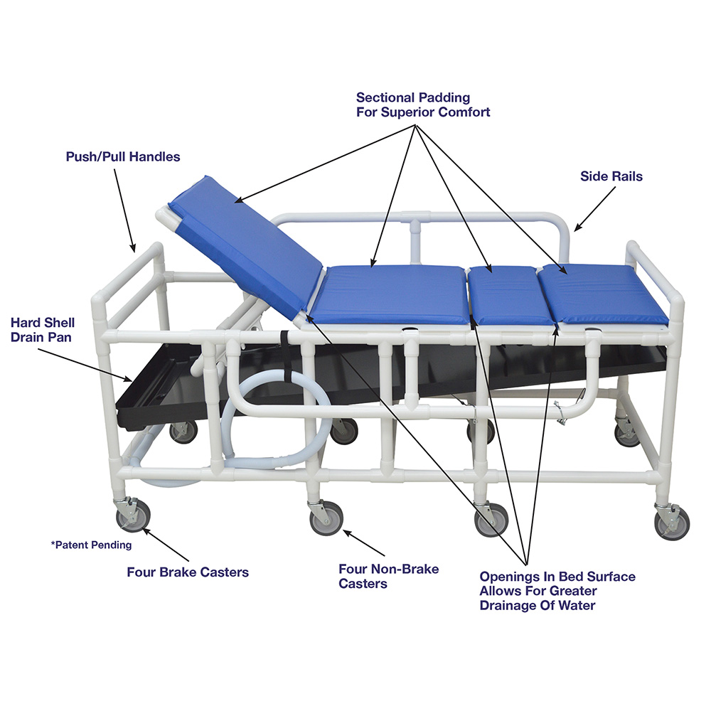 Healthcare Grade, Reinforced At All Stress Related Areas, Shower Gurney With Five Position Elevating Headrest, Closed Cell Foam Pad, Drain Pan And Hose, Dual Drop Side Rails, Bariatric Shower Gurney.
