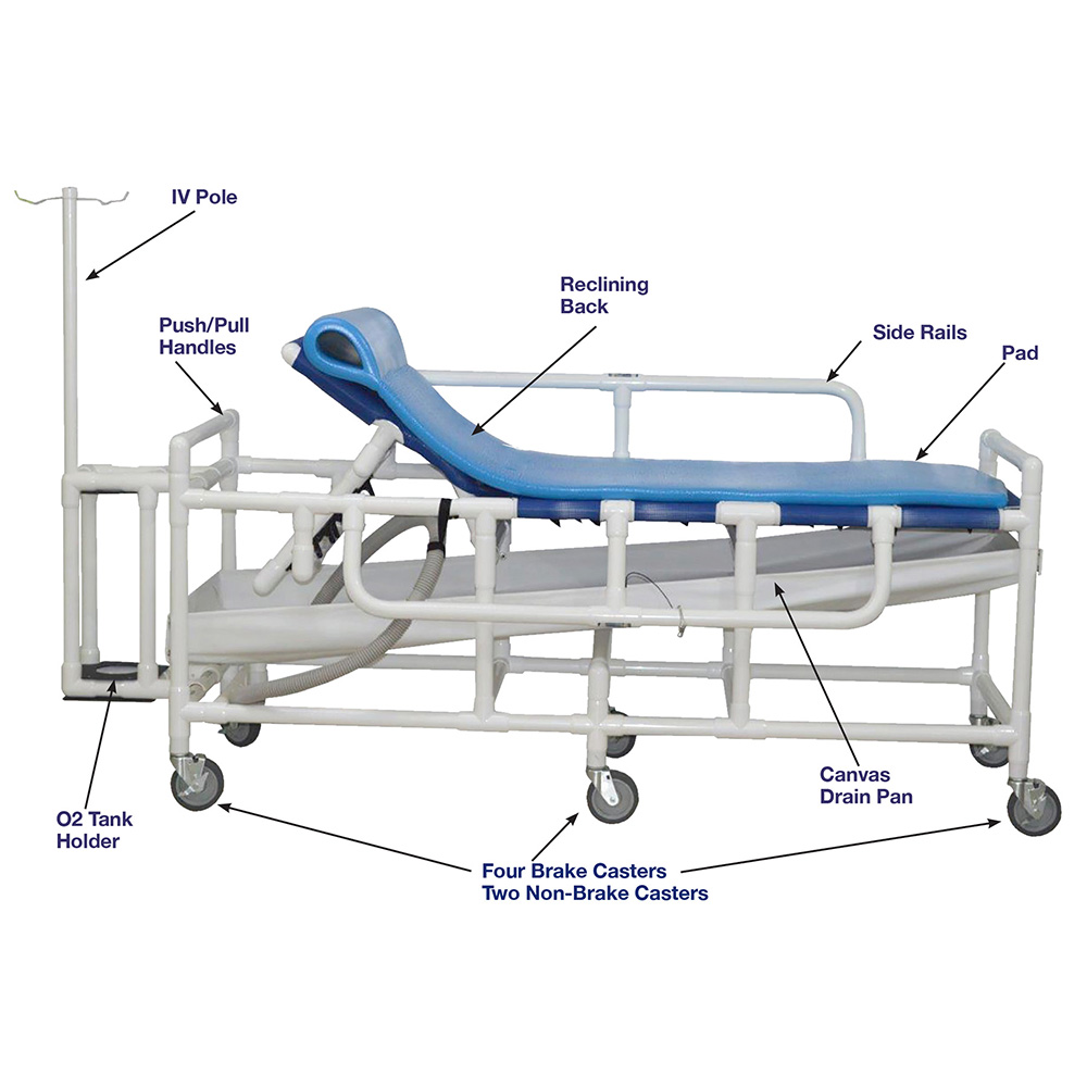 Five Position Shower Gurney Comes With Closed Cell Waterproof Foam Pad. Durable Vinyl Cover Is Easy To Clean And Will Not Promote Bacteria Growth.