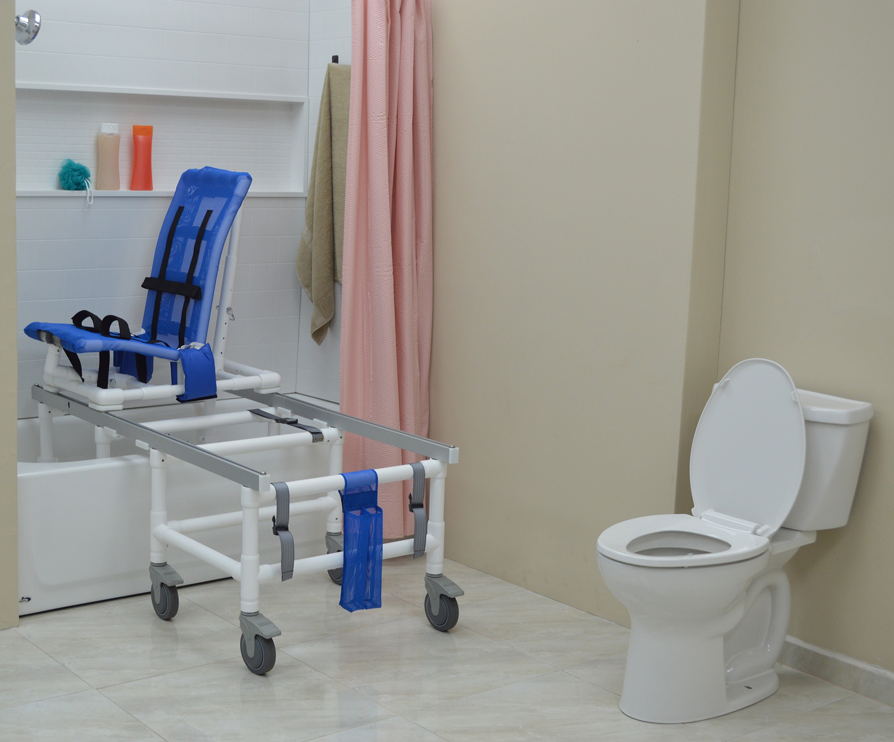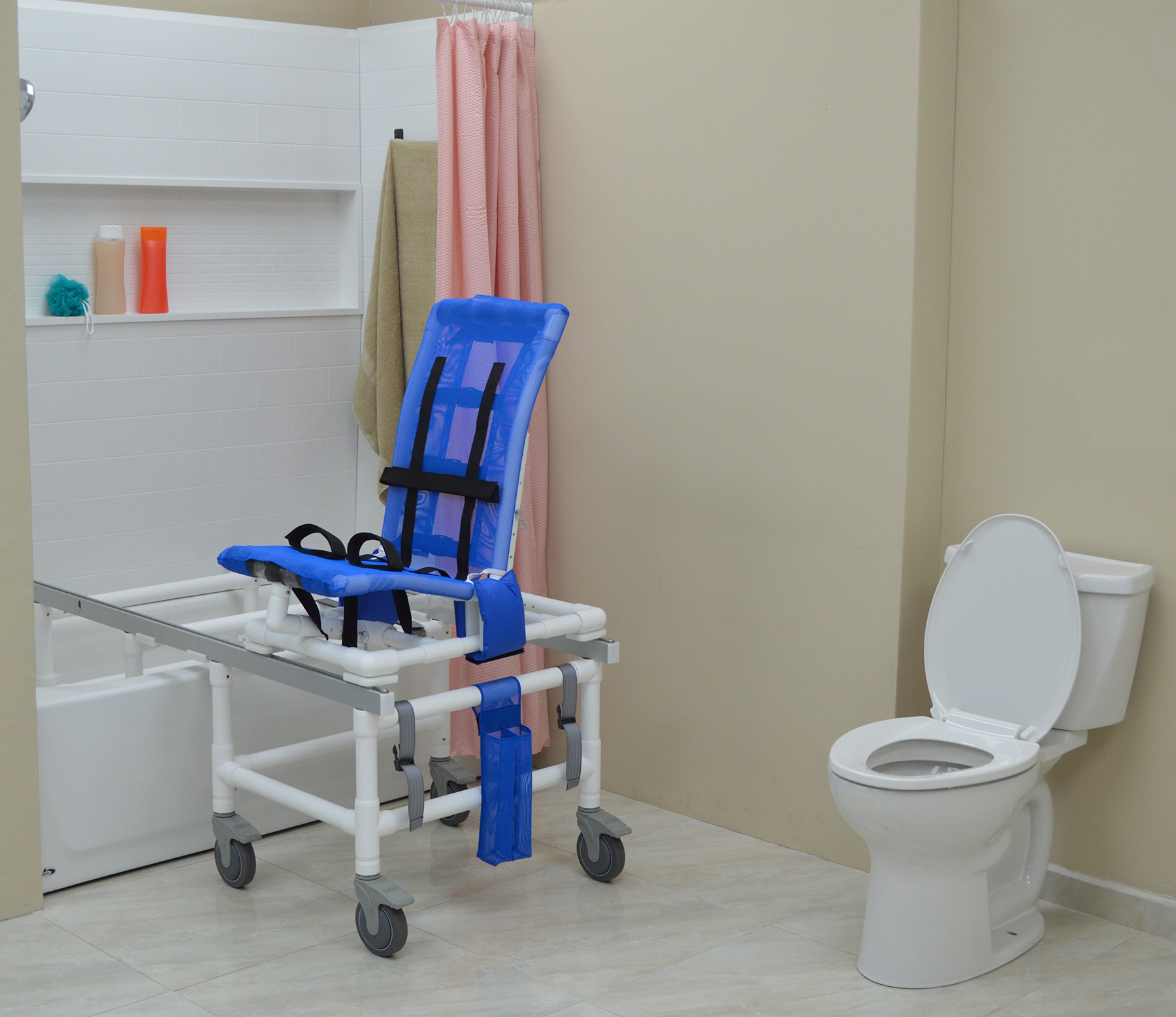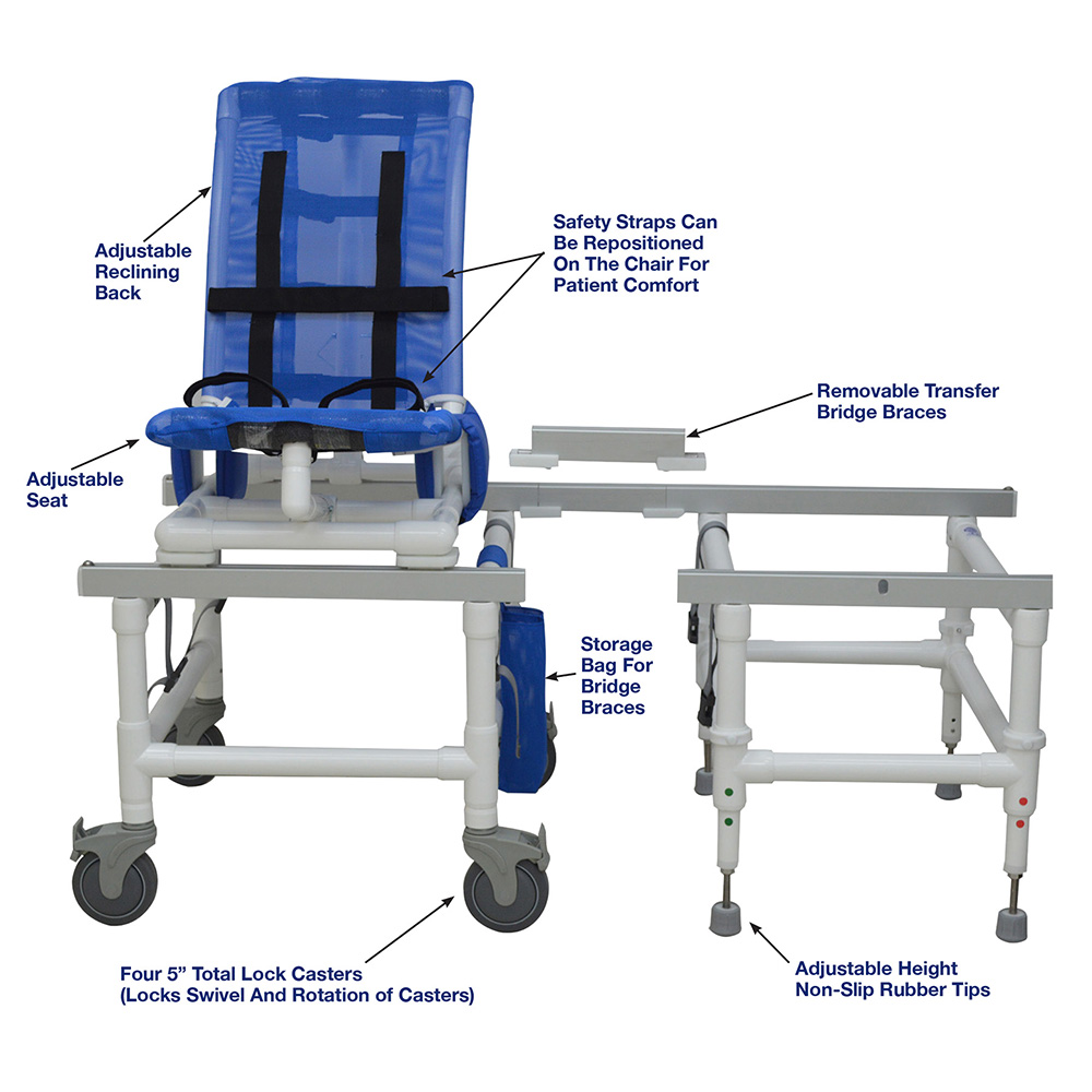 MJM’s Dual Shower/Transferchairs Reduce The Need For Unnecessary Transfers Thus Creating A Safe And Secure Environment For Toileting And Bathing. Our Unique Removable Transfer Bridge Braces Allow For The Tub/Shower Section Of The Chair To Fit Completely In The Tub Or Shower Stall Permitting Closure Of A Shower Curtain Or Shower Door For Privacy.