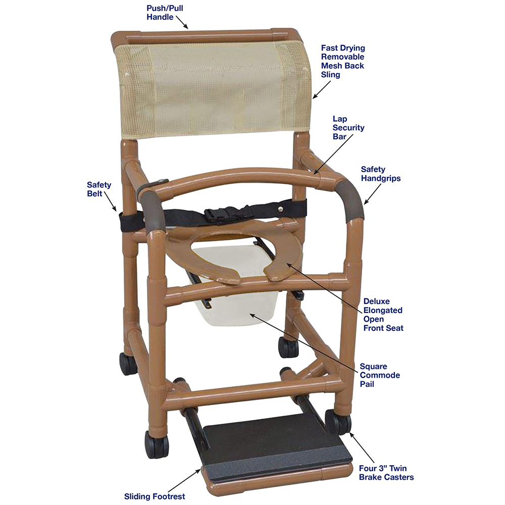Healthcare Grade, Deluxe Elongated Open Front Seat Enhances Resident Comfort, Safety Handgrips, Push/Pull Handle And Fast Drying Removable Mesh Back/Sling, Satefy Lapbar, Safety Belt, Square Commode Pail, Sliding Footrest And Reinforced At All Stress Related Areas.
