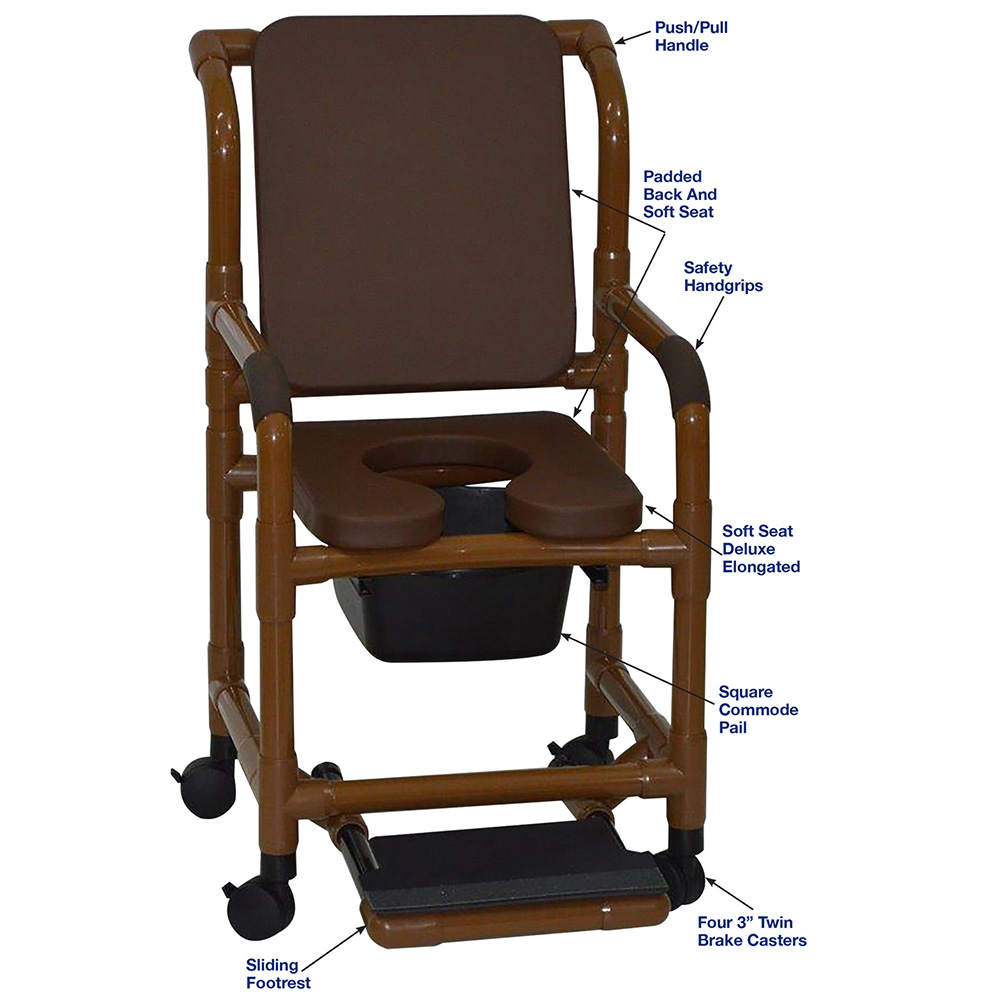 WoodTone Shower Chair With Soft Seat Deluxe Elongated, Cushion Back, Square Pail, And Sliding Footrest