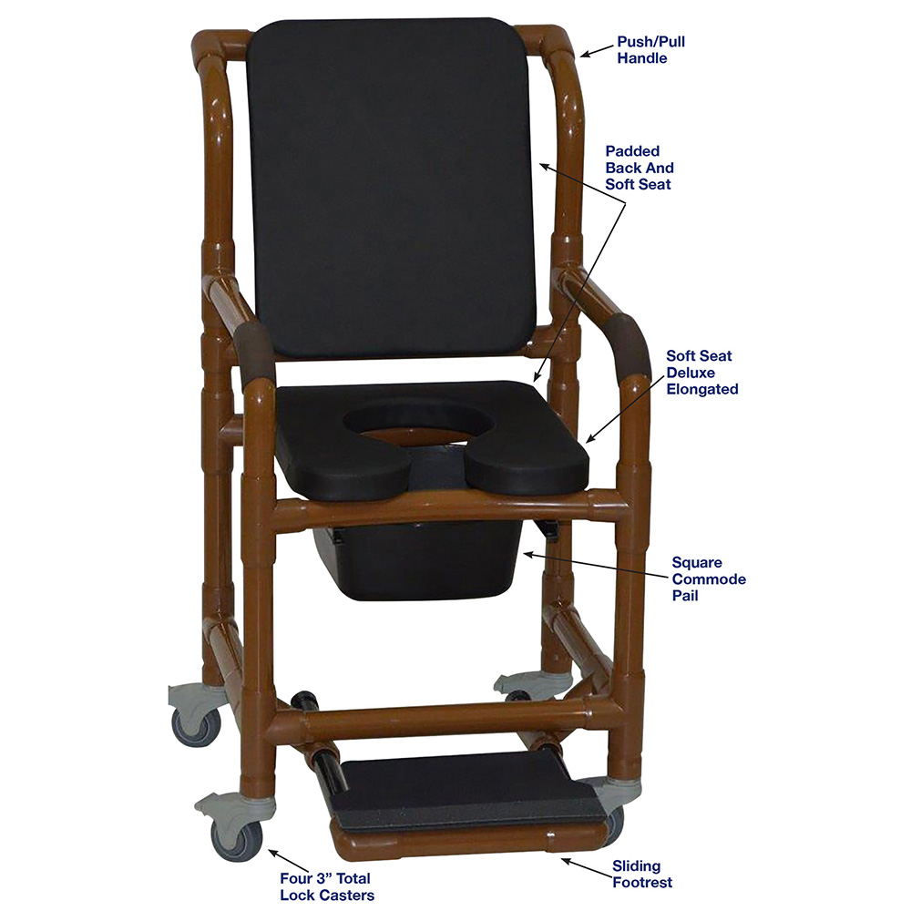 WoodTone Shower Chair With Total Lock Casters, Soft Seat Deluxe Elongated, Cushion Back, Square Pail, And Sliding Footrest