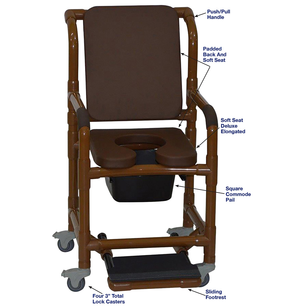 Healthcare Grade, Deluxe Elongated Open Front Soft Seat Enhances Resident Comfort, Cushion Padded Back, 10 QT Slide Out Commode Pail, Push/Pull Handle, Slidng Footrest, Reinforced At All Stress Related Areas.