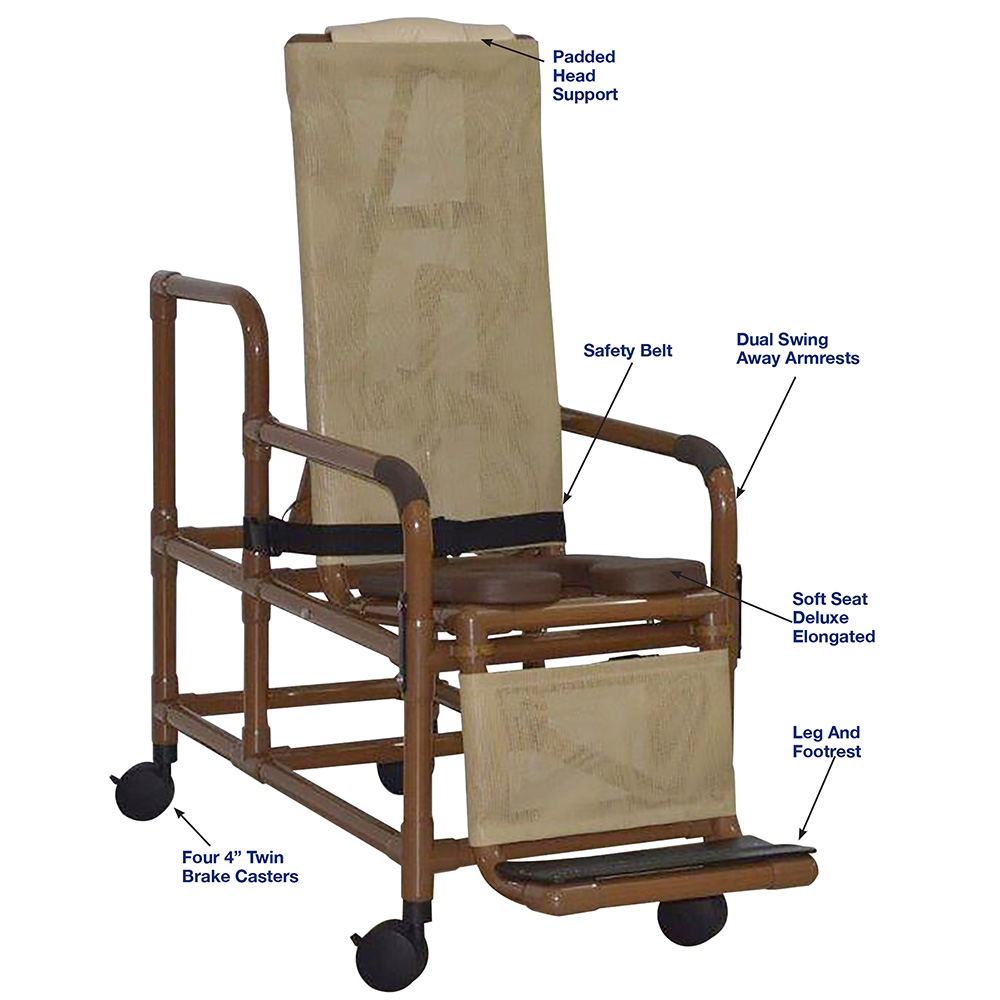 Healthcare Grade, Dual Swing Away Armrests (Secured With Safety Vinyl Straps), Deluxe Elongated Open Front Soft Seat Enhances Resident Comfort, 7 Positions to Accommodate All Your Needs, 4” Twin Casters, Comes With Safety Belt, Safety Handgrips, Fast Drying Mesh Back/Sling, Reinforced At All Stress Related Areas, Must Be Used With Assistance.