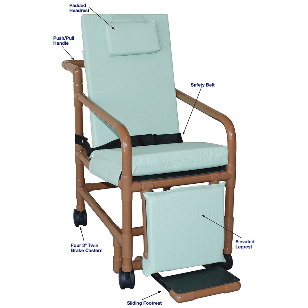Healthcare Grade, Reinforced At All Stress Related Areas, Elevated Padded Legrest Reduces Pressure To Protect Against Pressure Ulcers, Multi-Position Leg And Head Rest Will Allow Maximum Comfort, Three Individual Cushions Covered With Anti-Bacterial Fabric, Built-In Wedge To Avoid Sliding, Solid Base Under Cushion Will Prevent From Bottoming Out, Push/Pull Handle Also Serves As A Safety Catch For Recline Back, Head Pillow, User-Friendly Adjustable Safety Belt Is Secured At All Times To Geri-Chair Frame, Ergonomic Bent Arms (No Sharp Edges) Allow Smooth Lateral Transfer, Standard For Average Size Resident.